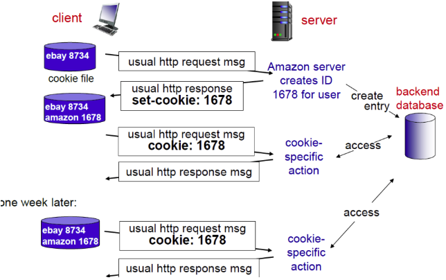 쿠키(Cookie) 쿠키(Cookie) - 사용자와 서버 간의 상호작용을 돕는 도구입니다. - HTTP 서버는 Stateless한 특성을 가지는데 그러한 점을 보완하기 위한 도구(State 유지)입니다. - 대부분의 상용 웹 사이트들이 쿠키(Cookie)를 사용하여 사용자 상태를 추적하고 유지합니다. - 장바구지, 제품 추천, 사용자 식별 확인, 사용자 세션 상태(웹 e-mail) 등에 활용합니다. - 일반 프로토콜 종단은 송신자 / 수신자 사이의 다수의 전송들 간에 상태를 유지하지만, 쿠키는 HTTP 메시지가 상태를 전송합니다. - 제 3자에게 정보를 제공한다는 점에서 프라이버시 관련 이슈가 존재합니다. Computer Science/Computer Network 2023.05.20