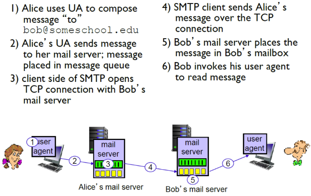 SMTP(Simple Mail Transfer Protocol) SMTP(Simple Mail Transfer Protocol) 메일 송신 - 보내는 사람의 메일 서버에서 받는 사람의 메일 서버로 메시지를 이동시켜줍니다. - 안정적인 전송을 위해 TCP연결을 사용하고, 포트 번호는 25번입니다. - 직통 연결이 가능합니다. - Application Layer에서의 Hand Shaking 과정, 메시지 전송과정, 연결 닫힘 과정이 있습니다. - 지속적인(Persistent) 연결이 가능합니다. (보내는 사람의 메시지가 여러개 이면 하나의 TCP 연결로 발송 가능합니다.) SMTP 프로세스 SMTP 연결구간 : 4번 SMTP가 유저 에이전트로 Notification을 주지 않는다. 따라서 Mail Access Protocol이 필요합니다. Computer Science/Computer Network 2023.05.20