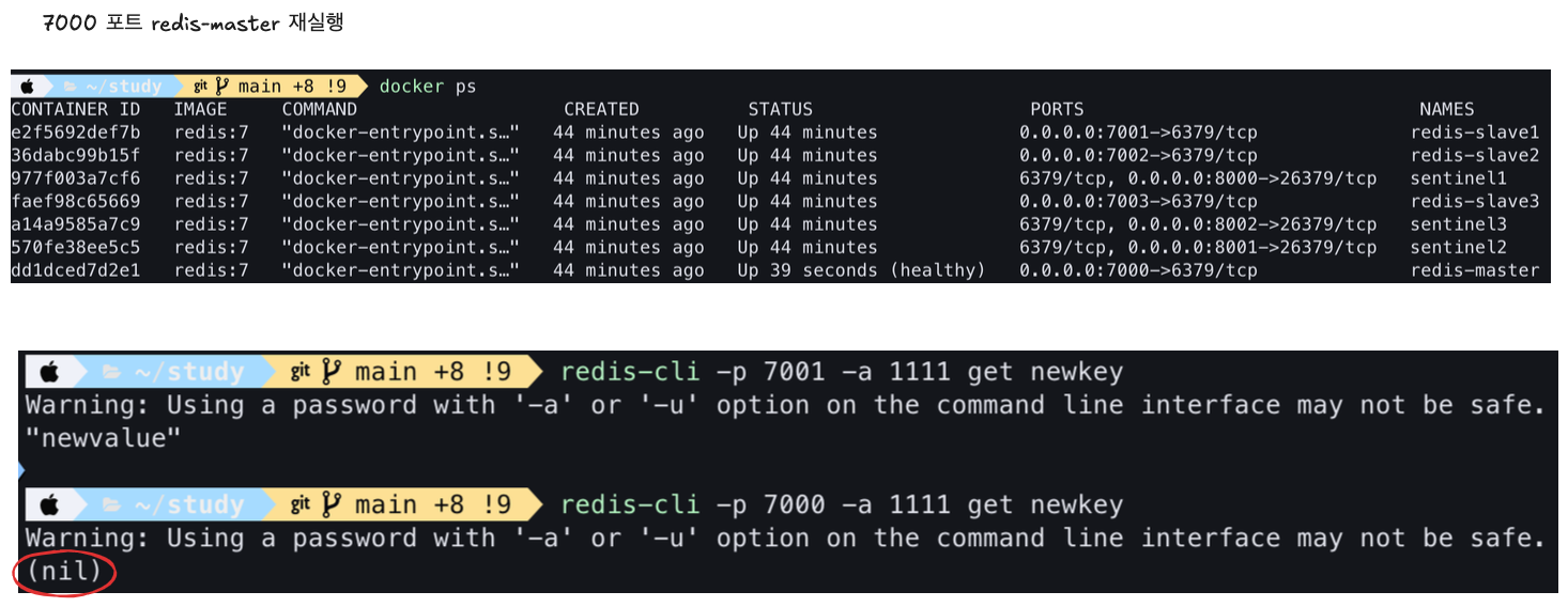 그래서 Redis-Master를 재실행하였지만, 클라이언트는 더 이상 7000포트를 신뢰할 수 없습니다.