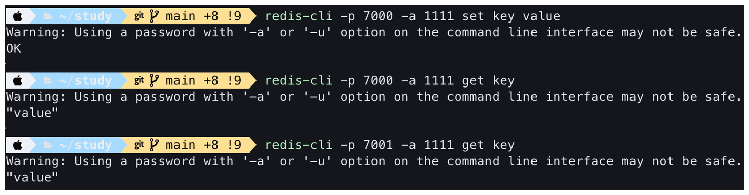 Client에서 write를 하기 위해 7000번을 사용하고, read를 하기 위해 slave(7001~3)을 사용하고 있습니다.