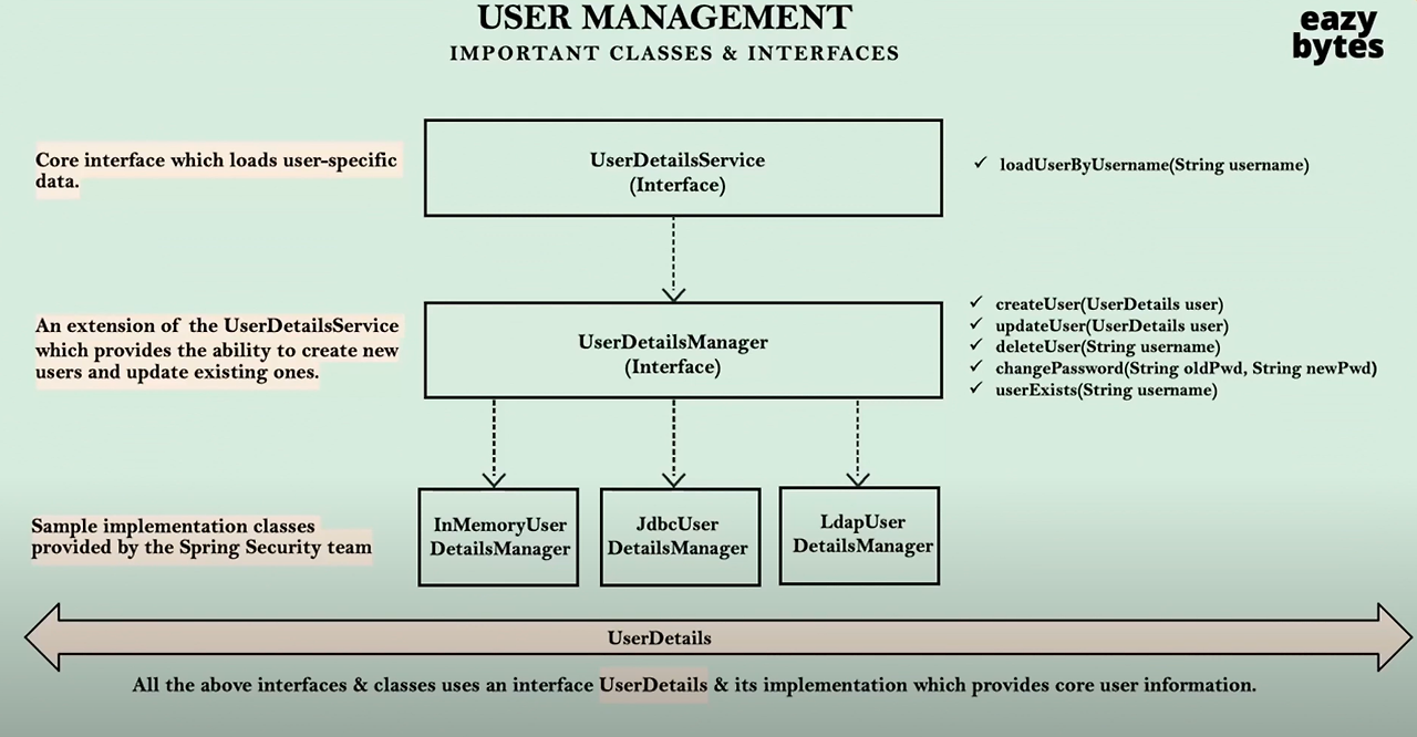 사용처: UserDetails는 저장 시스템에서 사용자 정보를 로드하는 모든 시나리오에서 반환 타입입니다. 예를 들어, UserDetailsService 및 UserDetailsManager 내부에서 사용됩니다.